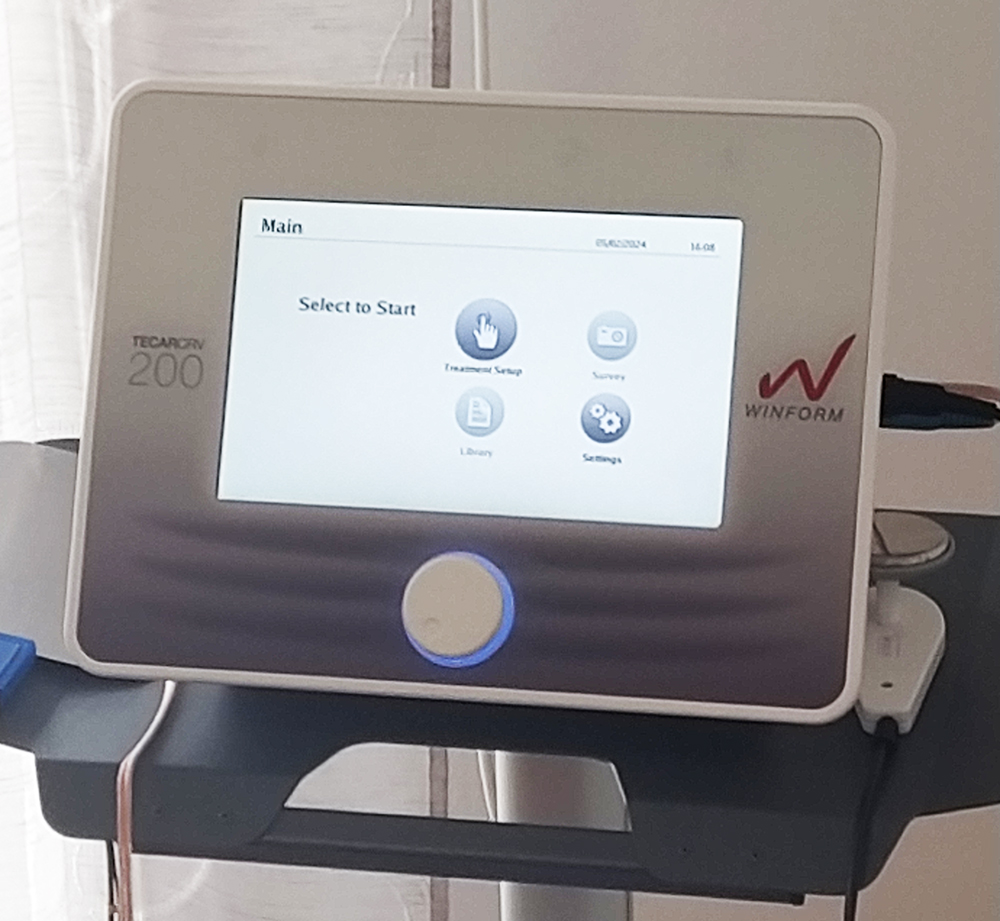 Furthermore, the Tecar CRV200 uses focused radiofrequency energy to act on all layers and sub-layers of the skin. Controlled tissue heating achieves a biostimulating effect, i.e. stimulates the production process of type 2 collagen. The production of said collagen results in tighter, firmer skin with fewer wrinkles. In addition to radiofrequency treatments, with the Tecar CRV200 device, we also perform electroporation, i.e. introduction of phytopharmacy (cosmetic preparations based on phyto) through the skin into the body without a needle.
